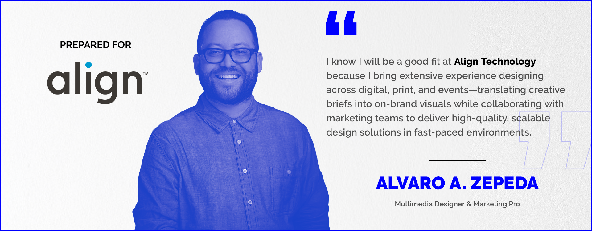 I would value the opportunity to be considered to contribute my design expertise and collaborative approach to Align Technology’s Creative and Marketing Communications team.