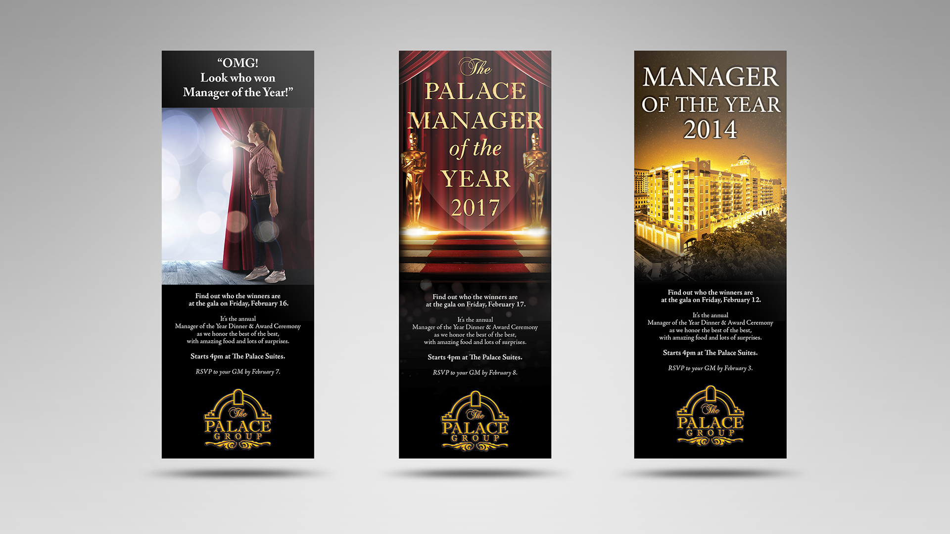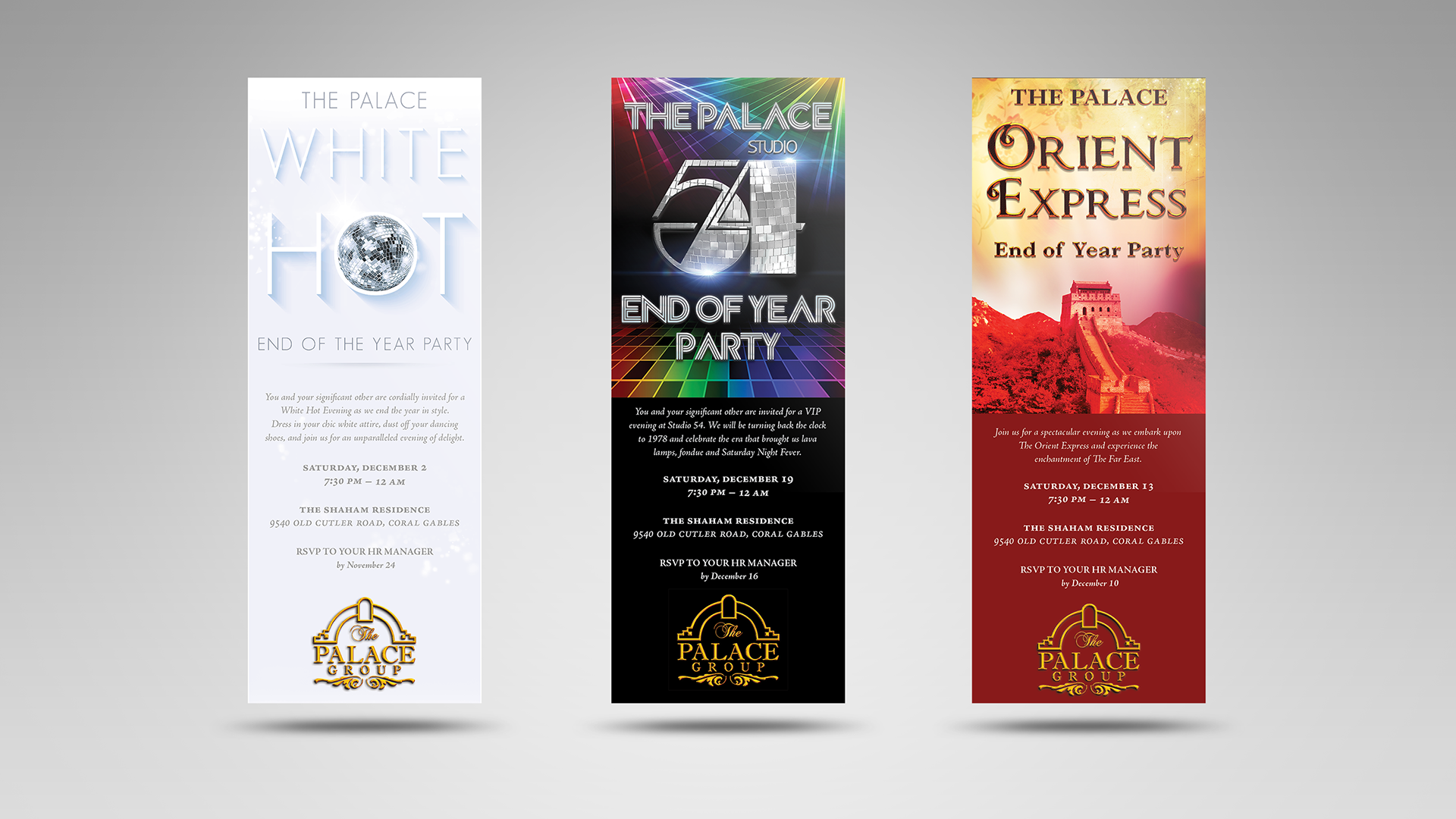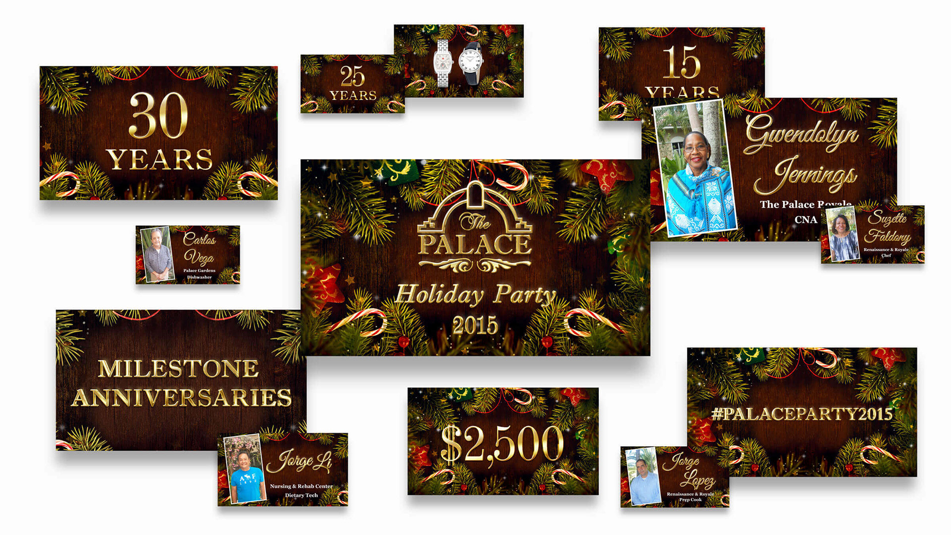 Overview: Three annual events for different levels of employees. The first, the manager of the year awards ceremony for managers and executives. The second, the corporation’s holiday party for all employees, and lastly, the end of the year gala for managers, executives, and VIPs.